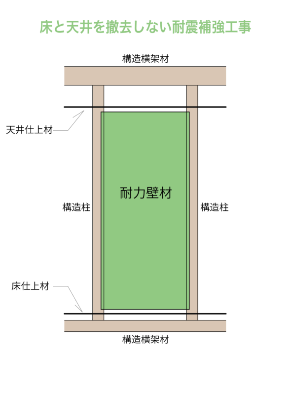 こちらの図をご覧ください。この場合、壁を補強するためには、天井や床の仕上げ材を解体・復旧する工事が必要となり、その分コストがかさんでしまいます。